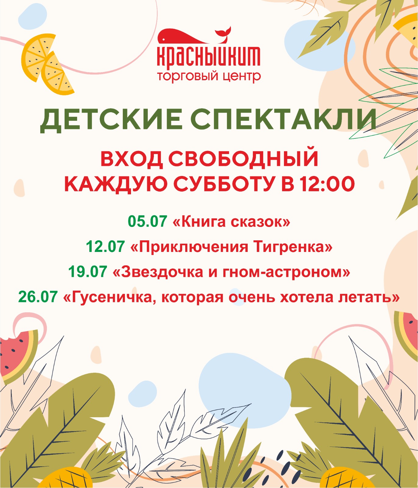Каждую субботу в ТЦ Красный Кит в 12:00 проходит целое театральное приключение для детей. Настоящие спектакли с героями, интригой и, конечно, счастливым концом!